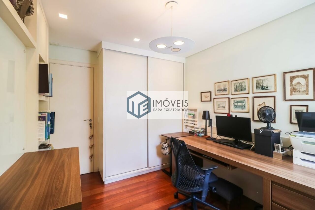 Totalmente mobiliado, o apartamento dispõe de armários planejados, lustres, ar-condicionado na sala e nos dormitórios, além de piso frio que facilita a manutenção. A planta ainda oferece escritório, suíte master confortável e dependência de quarto de empregados.