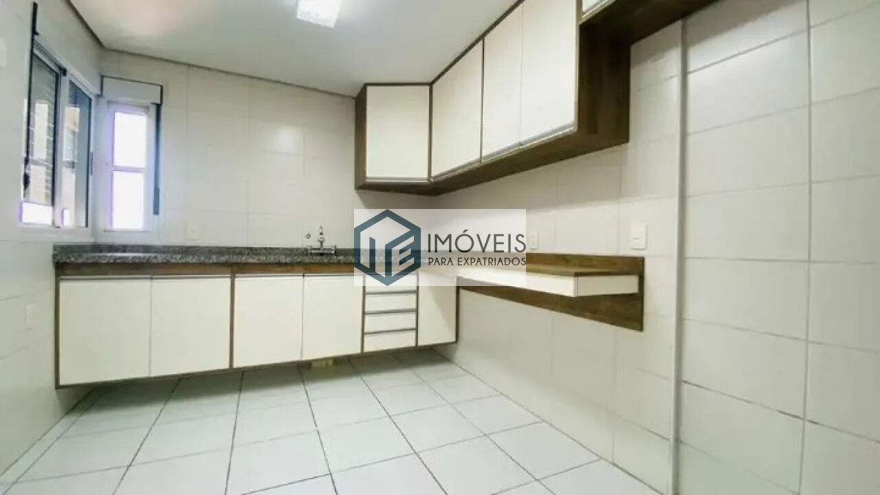São três dormitórios, sendo uma suíte com armários, além de banheiro social. A cozinha possui janela e armários planejados, integrada à área de serviço com banheiro de empregada. O apartamento está em andar alto e dispõe de duas vagas de garagem, além de depósito privativo.