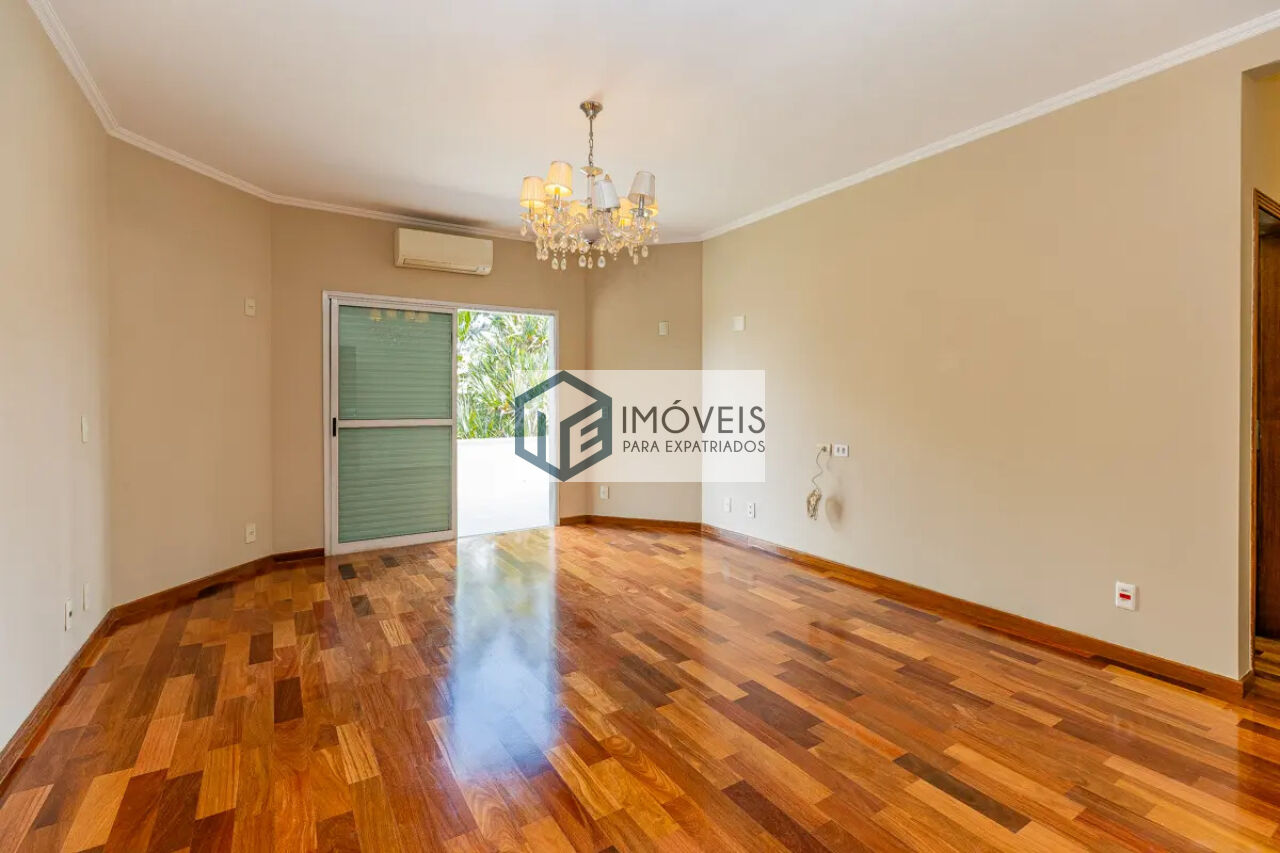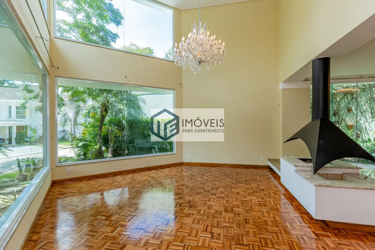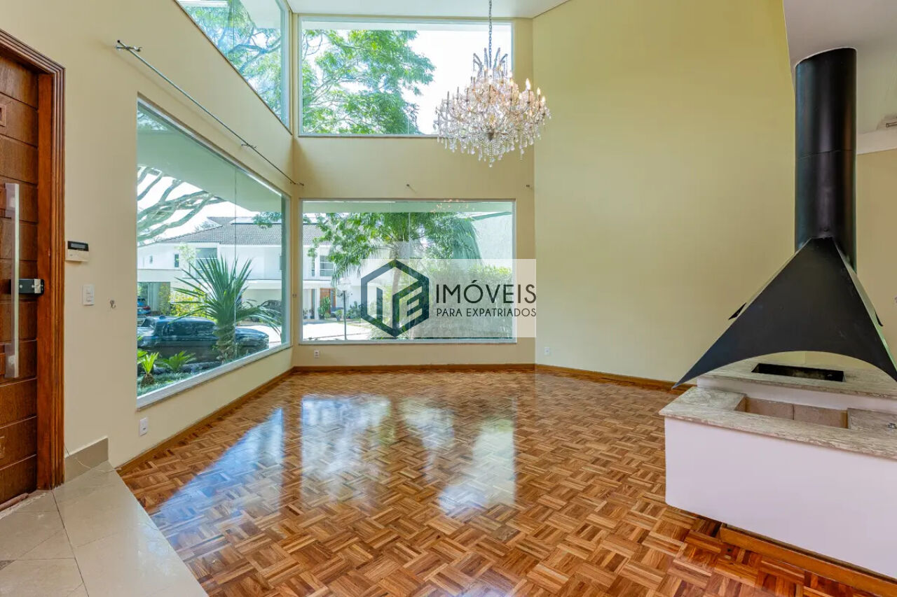 O living é extremamente espaçoso, com elegante piso em madeira, distribuído em três ambientes: sala de estar com lareira, sala de jantar e sala de TV. Conta ainda com lavabo decorado, ideal para receber visitas.