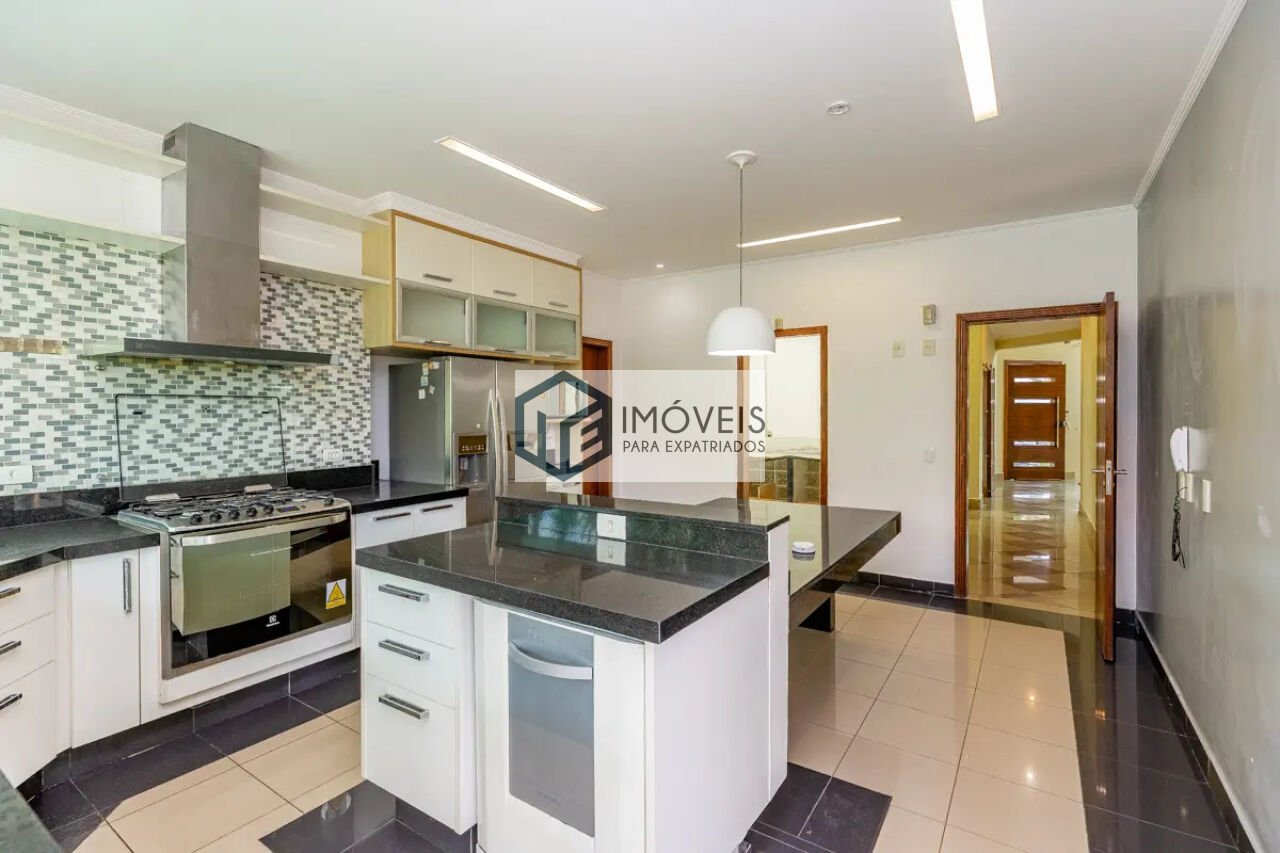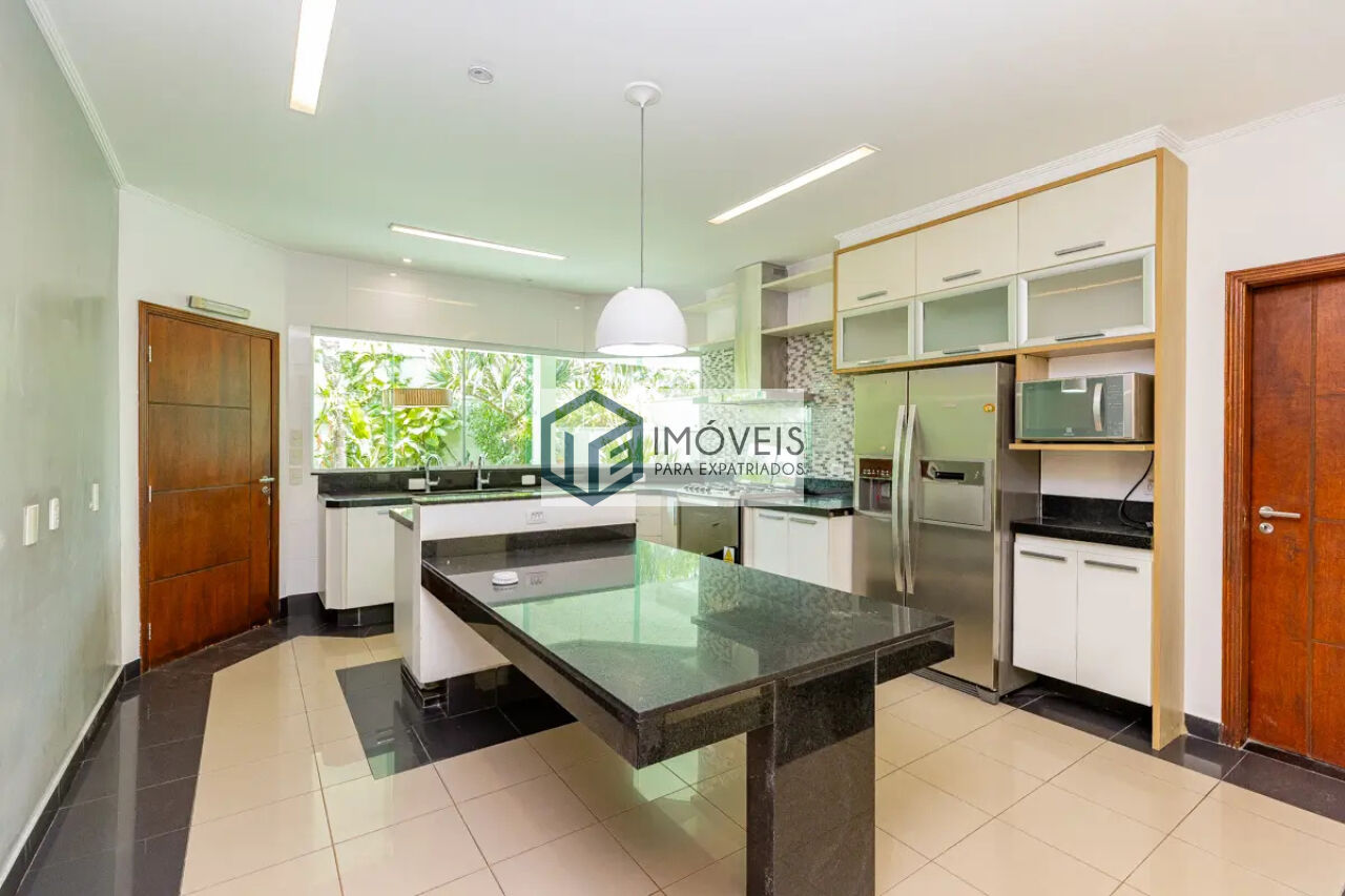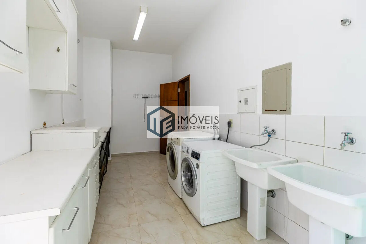 A cozinha planejada possui ampla marcenaria, fogão embutido e bancada de apoio, oferecendo praticidade e funcionalidade no dia a dia. A área de serviço é completa, com lavanderia equipada com máquina de lavar e secar, além de dependência para funcionários e despensa.