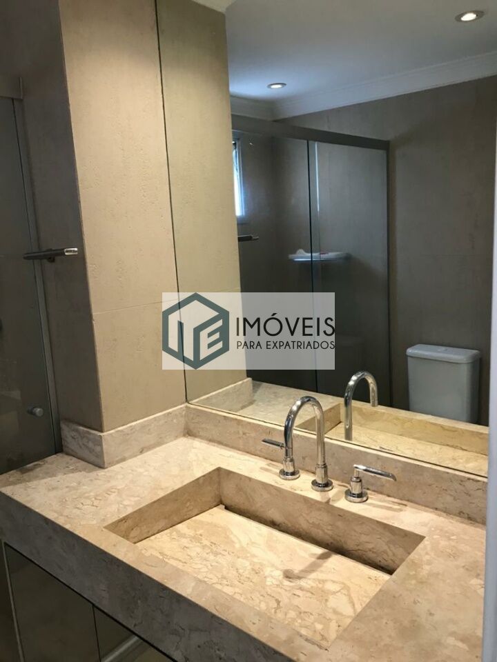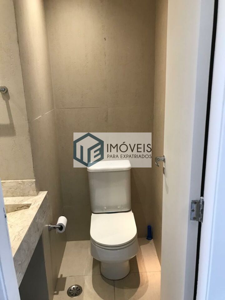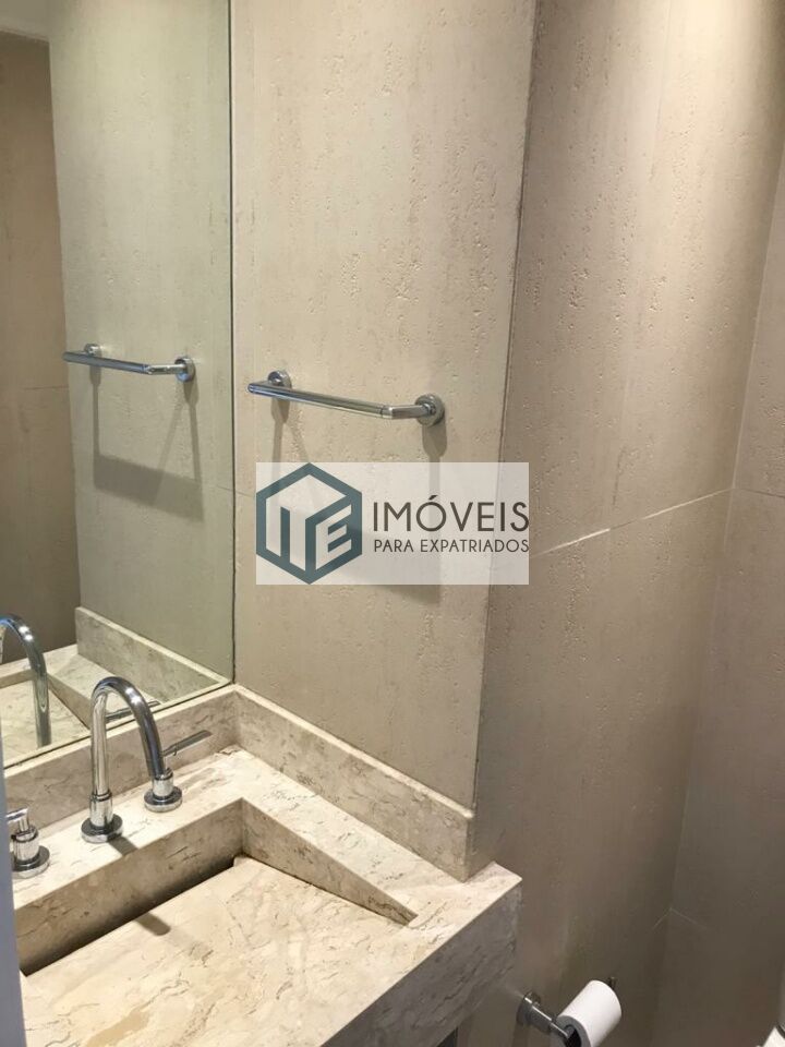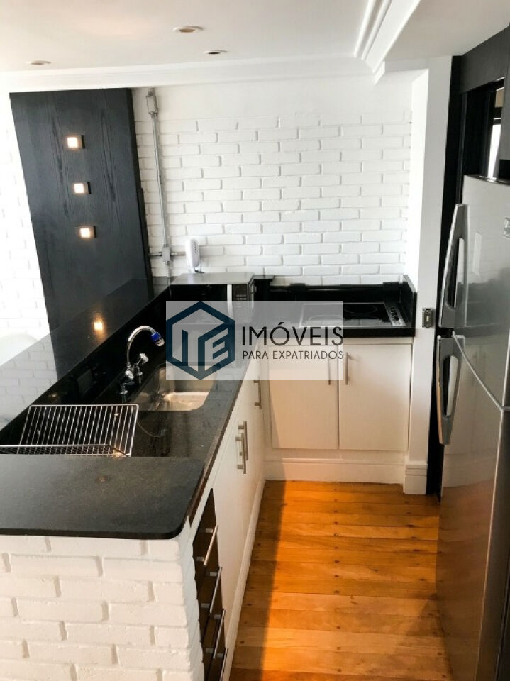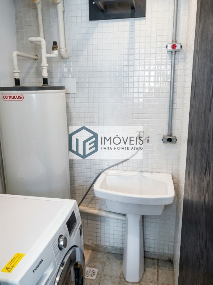A cozinha é planejada e completa, equipada com cooktop, micro-ondas, geladeira e uma charmosa mesa balcão com poltronas. O apartamento também dispõe de lavanderia privativa com máquina lava e seca, além de aquecimento central. Ainda neste pavimento, há um lavabo e um espaço dedicado para home office, com mesa e cadeira.