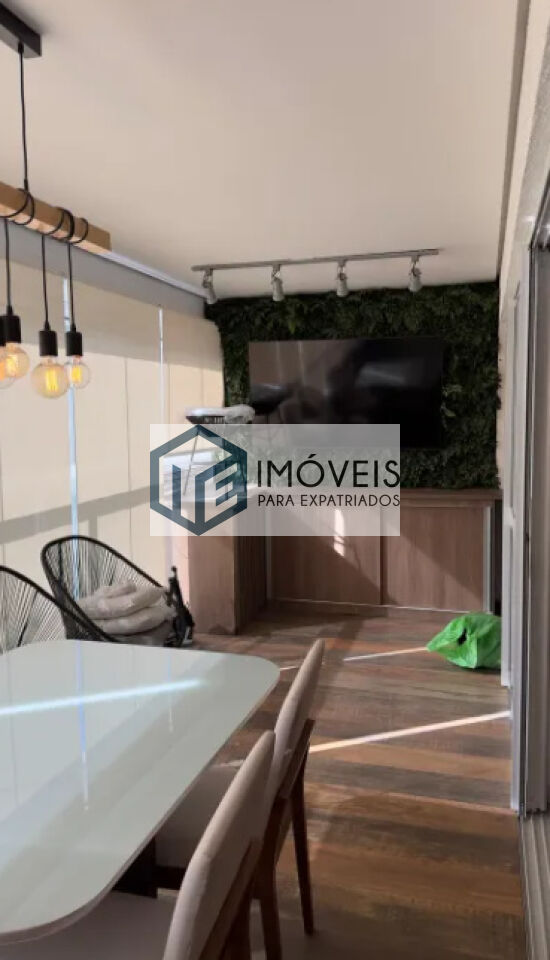 O apartamento está mobiliado, contando com geladeira, sofá, rack, mesa com cadeiras, lava-louças, ar condicionado, banquetas de cozinha, e armários (um na varanda, um no escritório e outro no quarto).