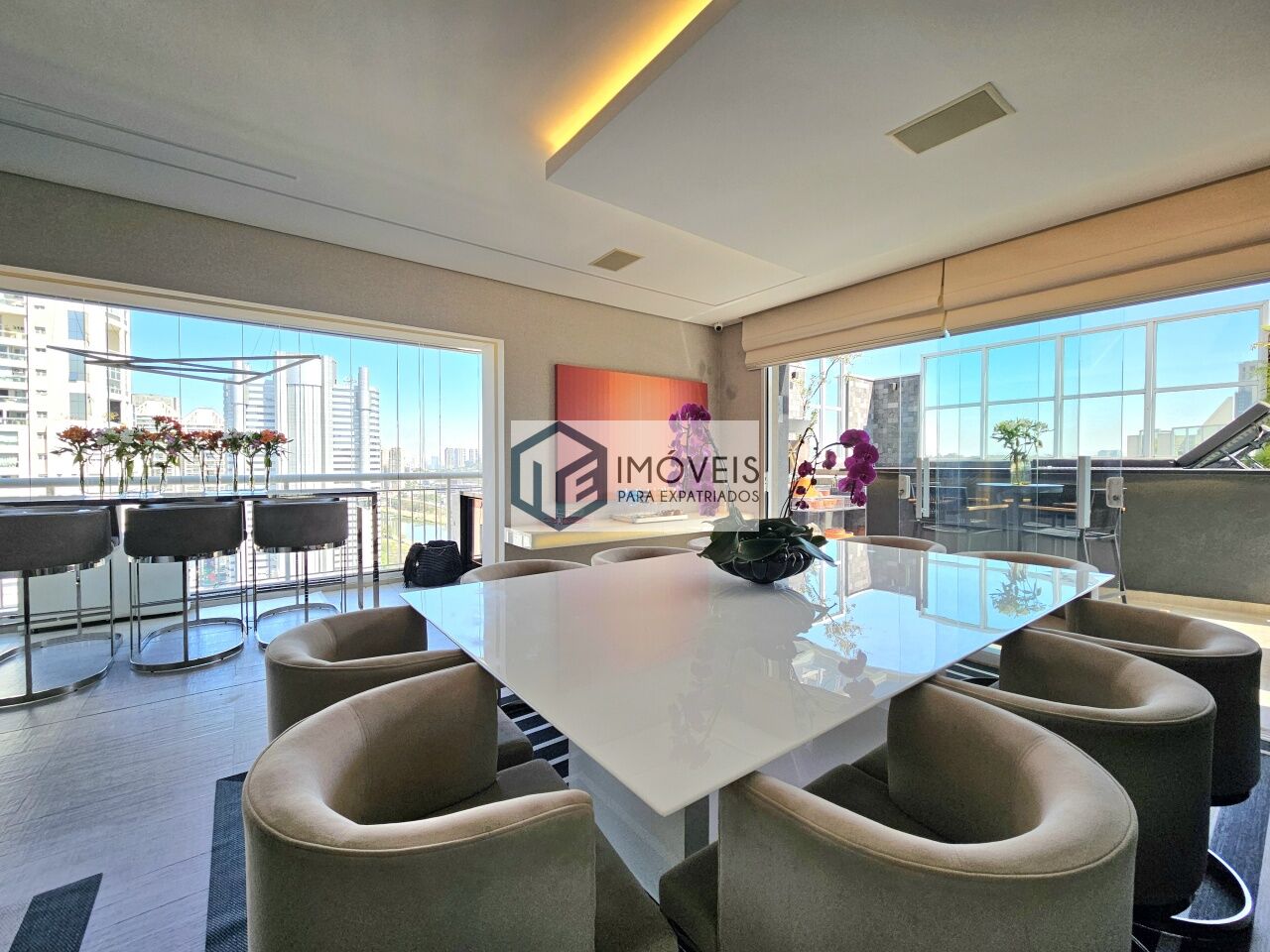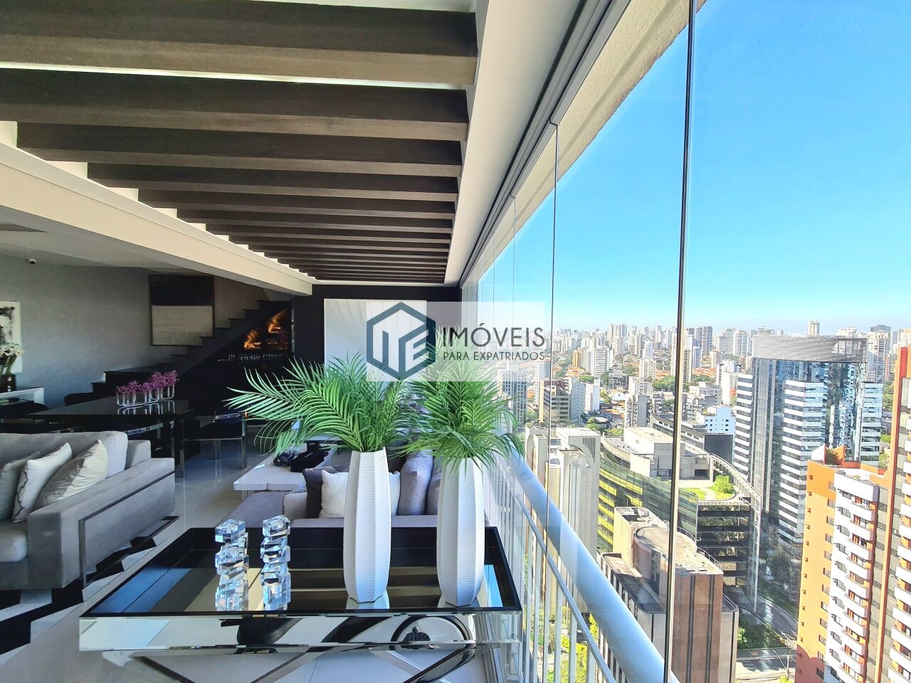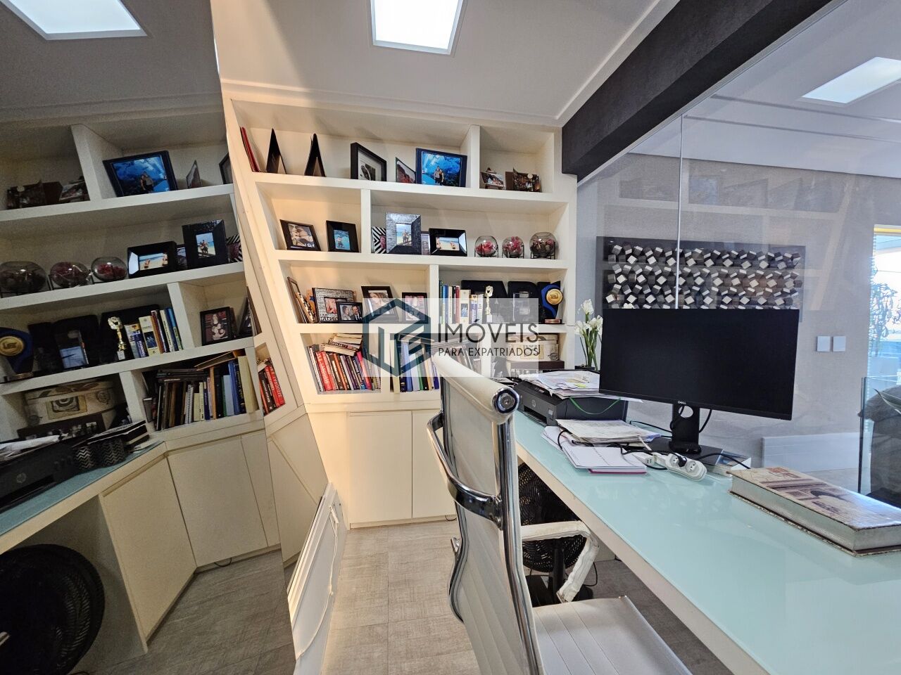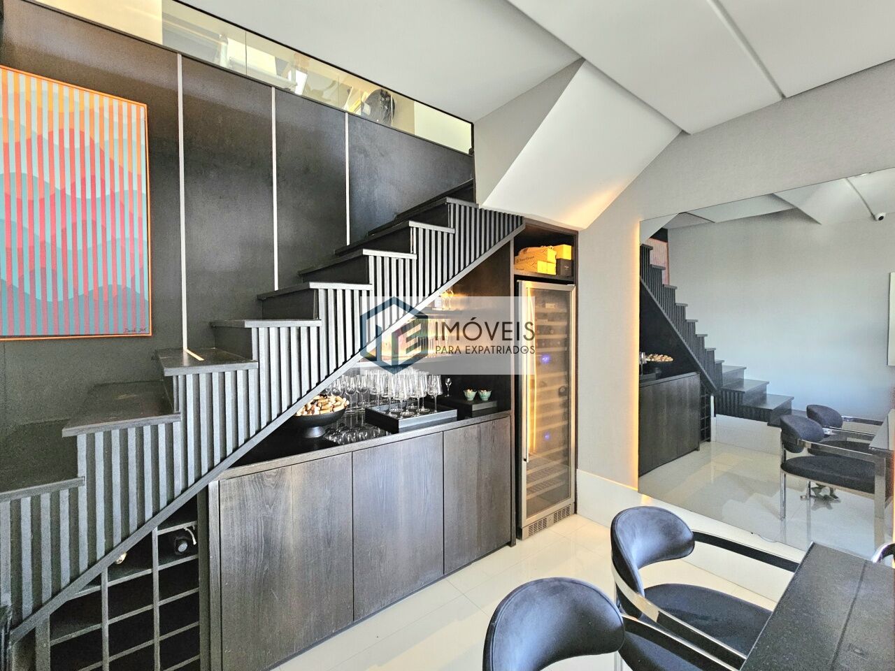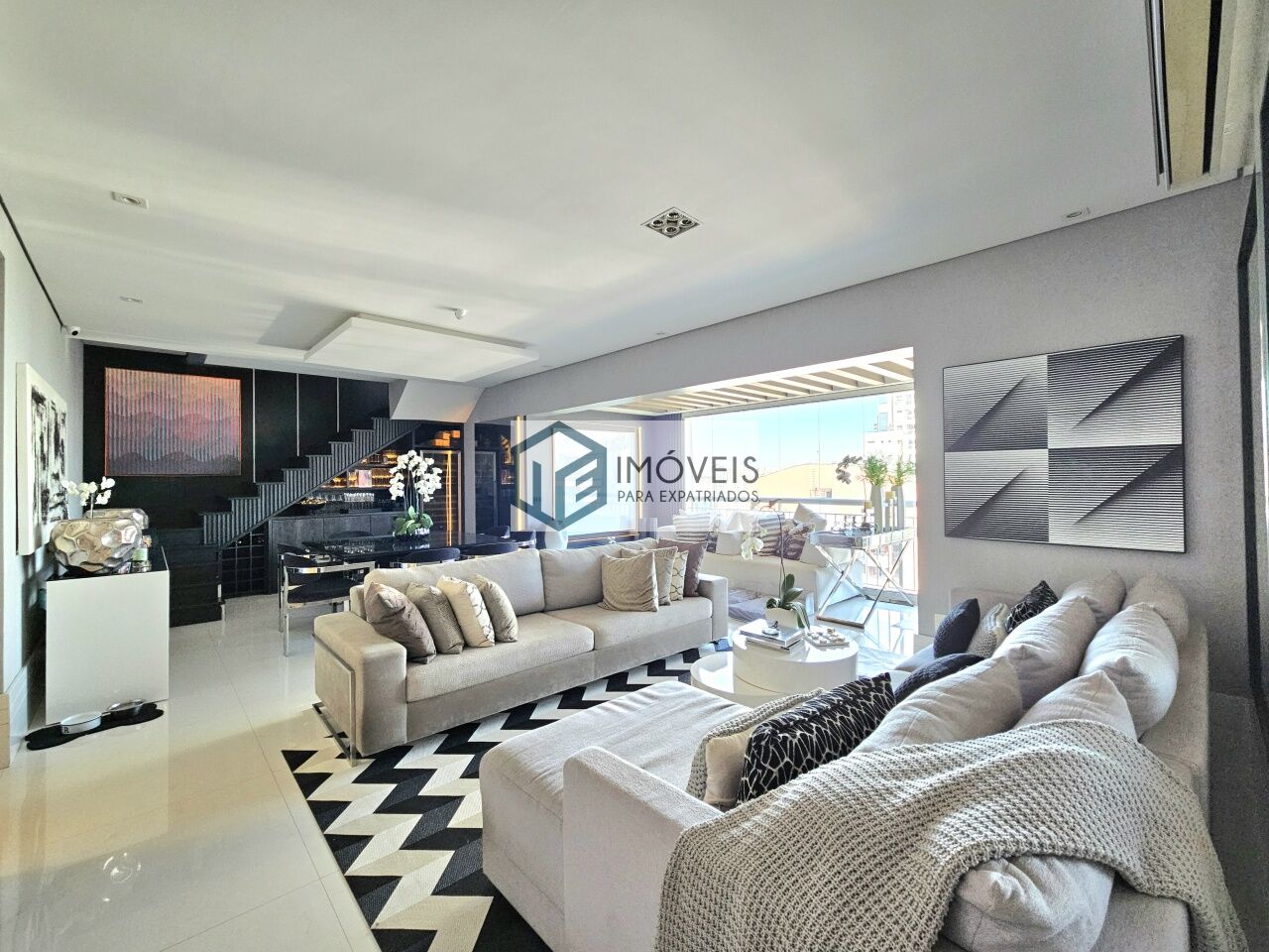Cobertura exclusiva à venda no Brooklin com 305?m², 4 dormitórios (sendo 3 suítes),3 vagas de garagem e uma vista espetacular da cidade. Projetada pela arquiteta Natalia Scheidt, a unidade é distribuída em dois pavimentos e oferece piscina privativa aquecida até 38?°C, revestida em pedra Hijau, com prainha, deck e lounge com lareira, além de varanda gourmet com churrasqueira a carvão e cozinha de apoio. No piso superior, estão as salas para três ambientes, lavabo, escritório, brinquedoteca (quarto reversível) e amplo depósito. No piso inferior, salas de estar e jantar com varanda integrada, lavabo, 3 suítes (a máster com closet ampliado e cabeceira personalizada),cozinha, lavanderia e dependência de serviço. Destaques das últimas reformas incluem ar-condicionado novo em todas as suítes e janelas antirruído em duas delas, garantindo máximo conforto acústico. Um imóvel sofisticado e completo, ideal para quem busca qualidade de vida e exclusividade em uma das regiões mais valorizadas de São Paulo.