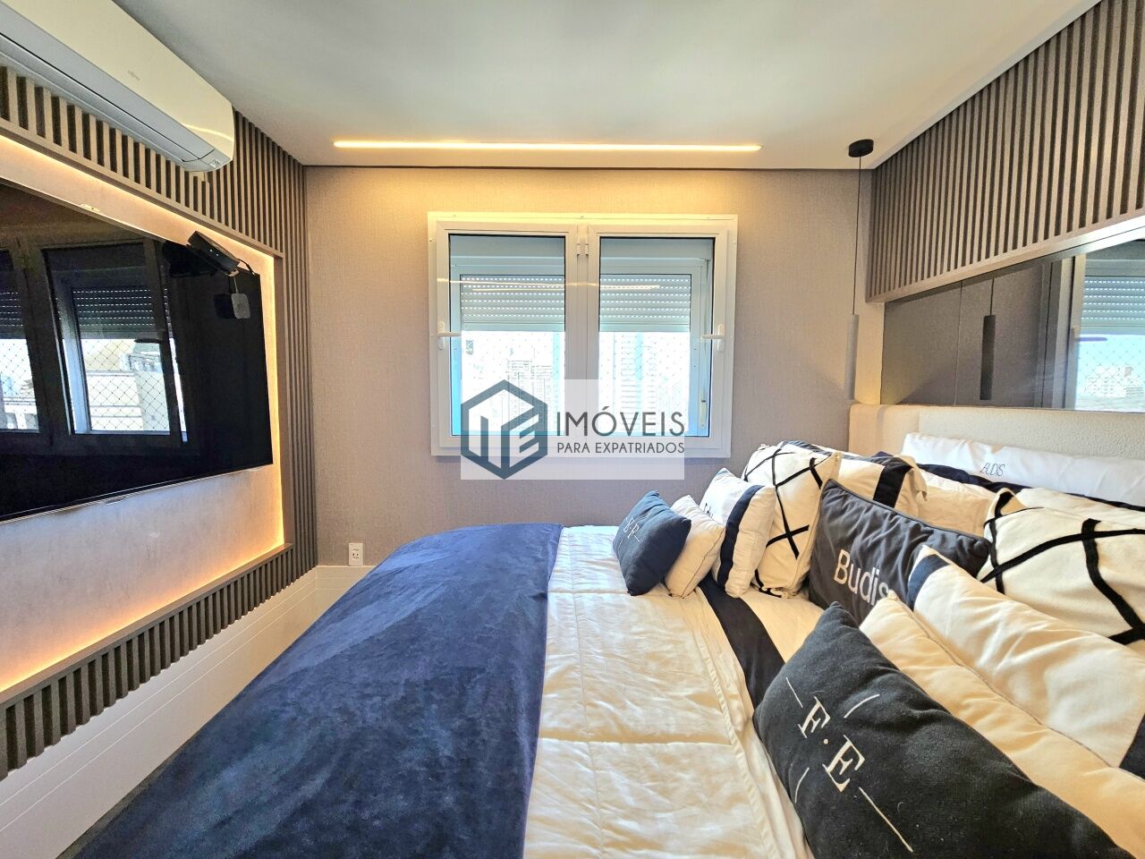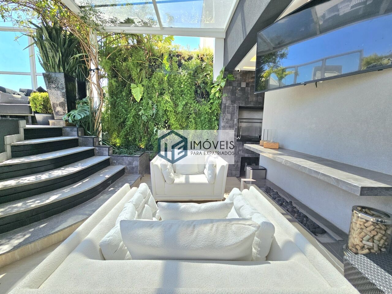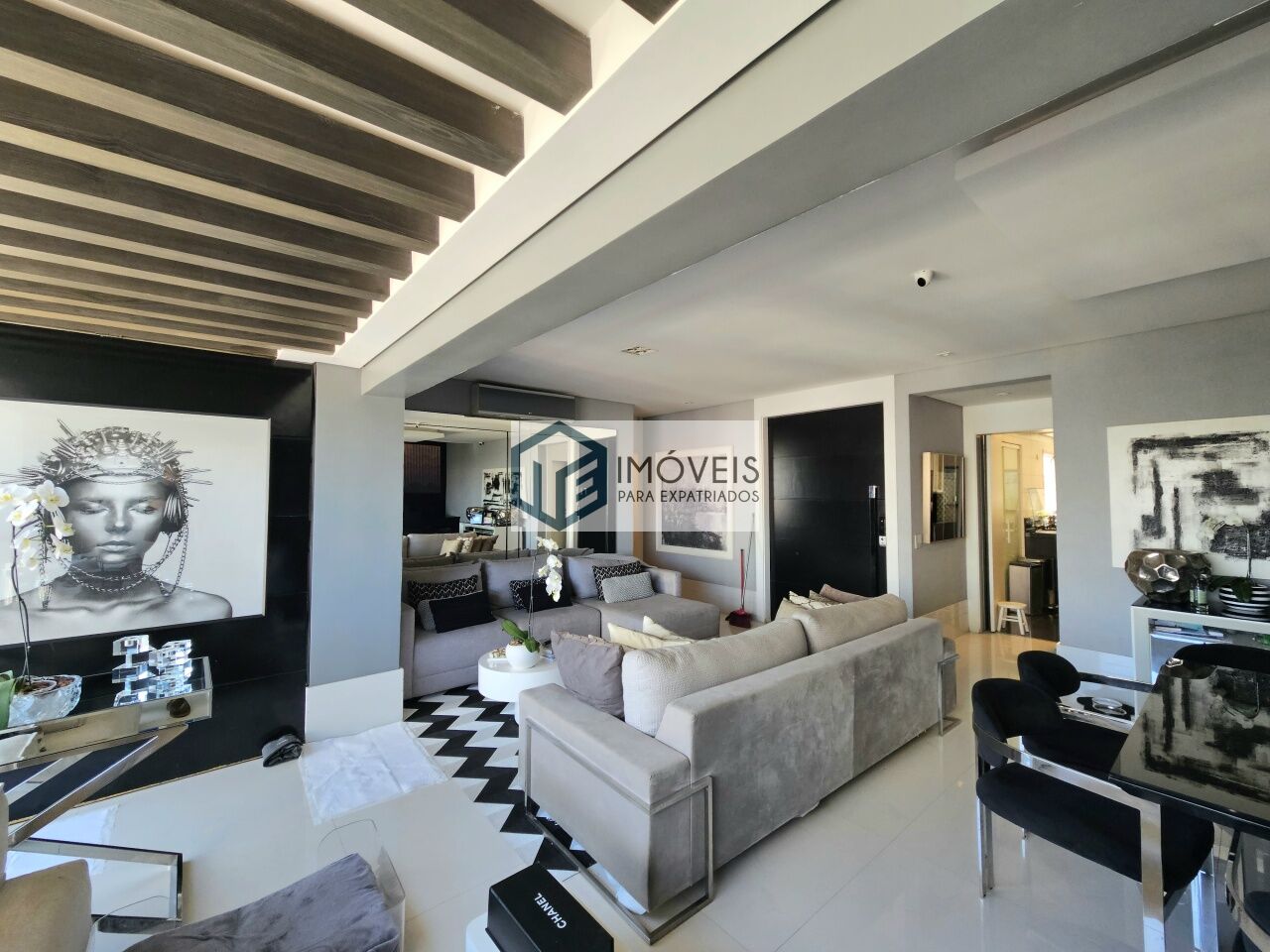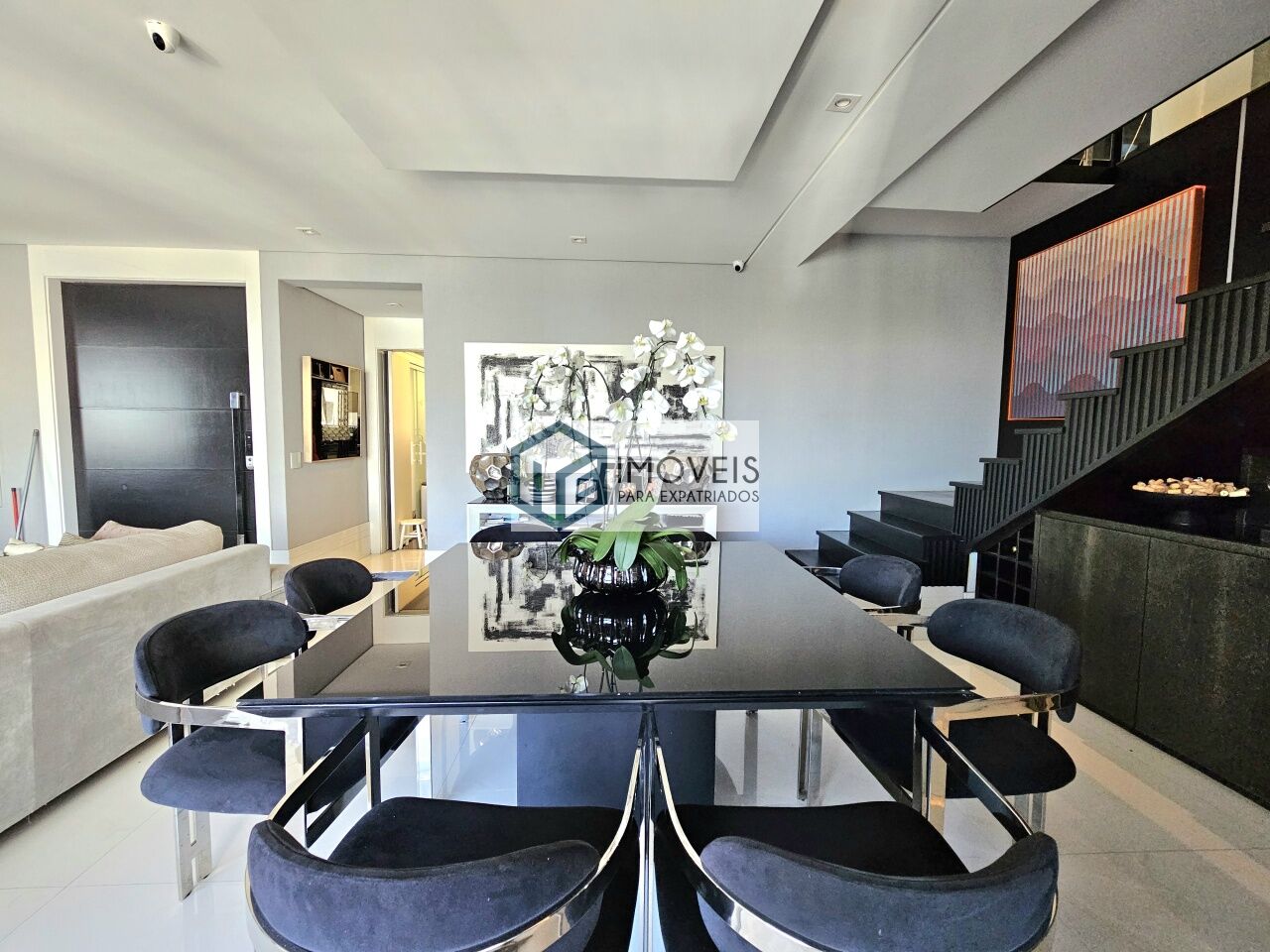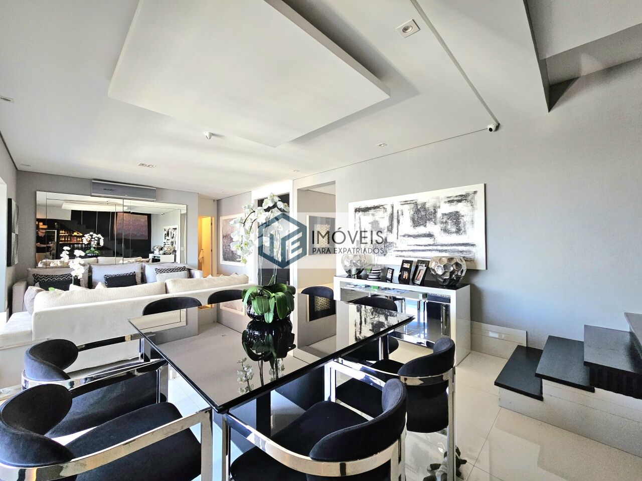 Cobertura exclusiva à venda no Brooklin com 305?m², 4 dormitórios (sendo 3 suítes),3 vagas de garagem e uma vista espetacular da cidade. Projetada pela arquiteta Natalia Scheidt, a unidade é distribuída em dois pavimentos e oferece piscina privativa aquecida até 38?°C, revestida em pedra Hijau, com prainha, deck e lounge com lareira, além de varanda gourmet com churrasqueira a carvão e cozinha de apoio. No piso superior, estão as salas para três ambientes, lavabo, escritório, brinquedoteca (quarto reversível) e amplo depósito. No piso inferior, salas de estar e jantar com varanda integrada, lavabo, 3 suítes (a máster com closet ampliado e cabeceira personalizada),cozinha, lavanderia e dependência de serviço. Destaques das últimas reformas incluem ar-condicionado novo em todas as suítes e janelas antirruído em duas delas, garantindo máximo conforto acústico. Um imóvel sofisticado e completo, ideal para quem busca qualidade de vida e exclusividade em uma das regiões mais valorizadas de São Paulo.