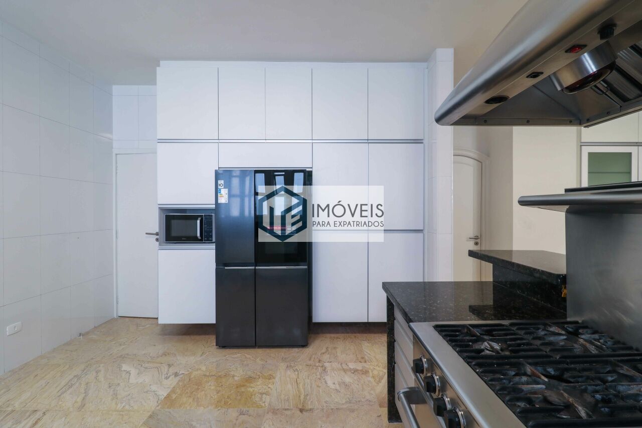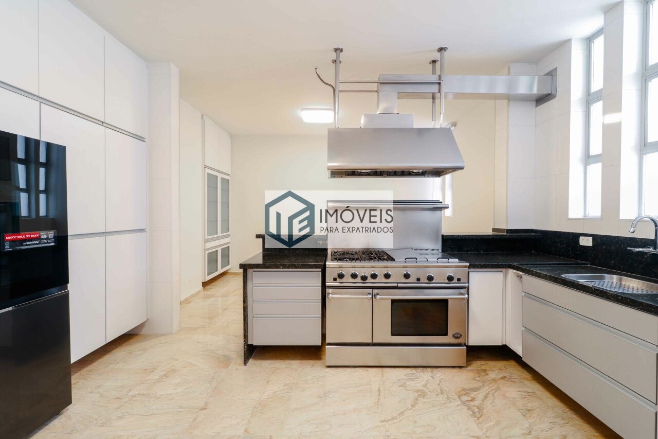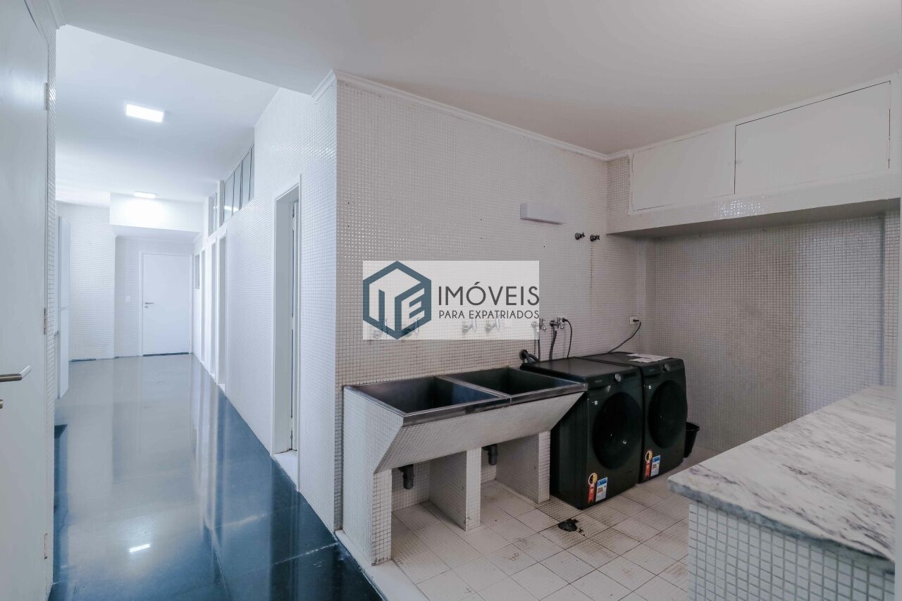 A cozinha espaçosa é equipada com marcenaria planejada e eletrodomésticos de primeira linha, complementada por sala de almoço e despensa. A área de serviço é completa, com lavadora e secadora, além de suíte para funcionários.
