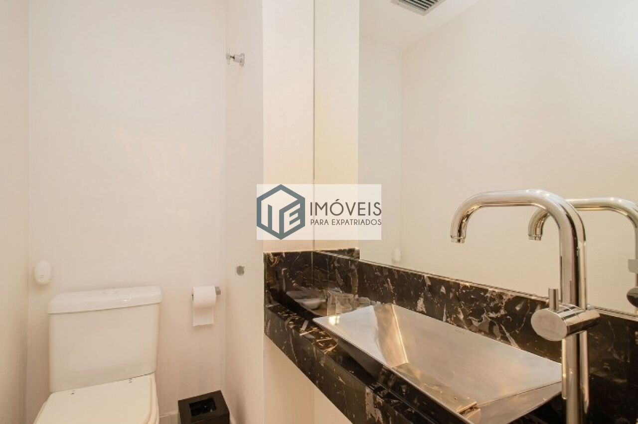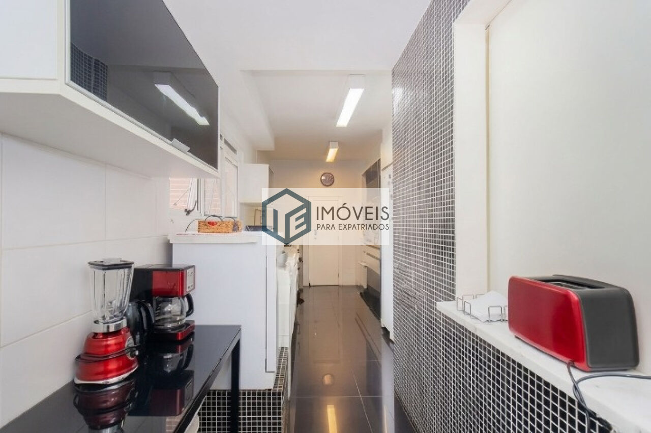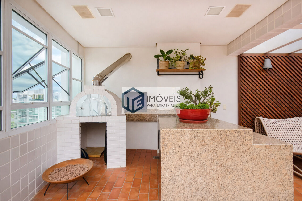 A parte superior possui um grande terraço privativo com forno de pizza, ideal para momentos de lazer e convivência. A cozinha é equipada com eletrodomésticos e o imóvel pode ser locado mobiliado (conforme parte do mobiliário das fotos) ou sem mobília.